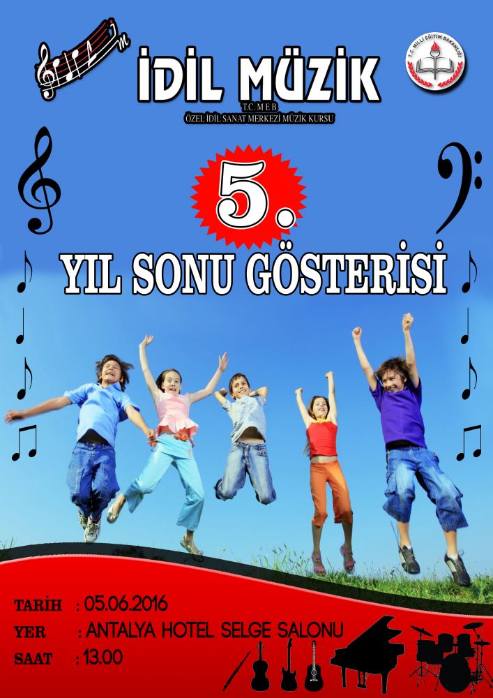 "T.C. M.E.B. İDİL MÜZİK SANAT MERKEZİ'nin geleneksel yıl sonu gösterilerinin 5. si ile karşınızdayız. Öğrencilerimiz, bir eğitim öğretim yılı boyunca kazandıkları bilgi ve tecrübeyi müzikseverlere ve velilerimize sergileyecekler. Sürpriz performanslar ,keyifli grup çalışmaları ve göz dolduran yetenekli öğrencilerimiz ile bu sene de çok keyifli bir yıl sonu gösterisi bizleri bekliyor. Her sene , müzik eğitimi alanında örnek gösterilen yıl sonu gösterilerimizin bu seneki ayağı Antalya Hotel Selge Salonu'nda gerçekleşecek. Bütün velilerimizi ve müzik meraklılarını aramızda görmek isteriz."
